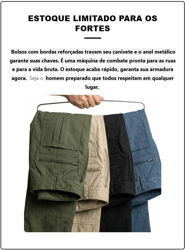 A Calça Delta é forjada com 70% poliéster e 30% algodão em trama Ripstop pura. Você encara o trabalho pesado ou o estádio com proteção implacável contra água e rasgos. É o fim das roupas descartáveis. Sinta a força bruta de um tecido que não cede nunca.